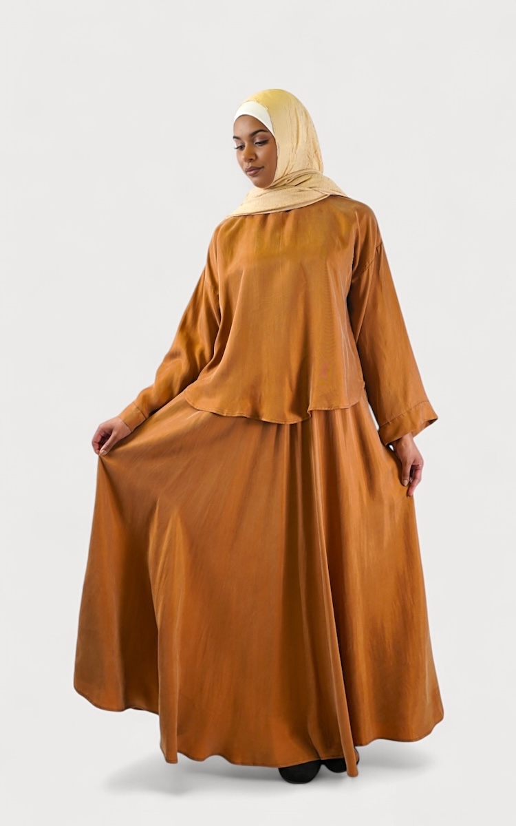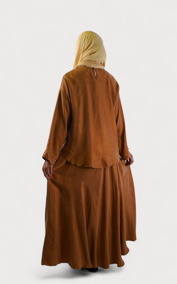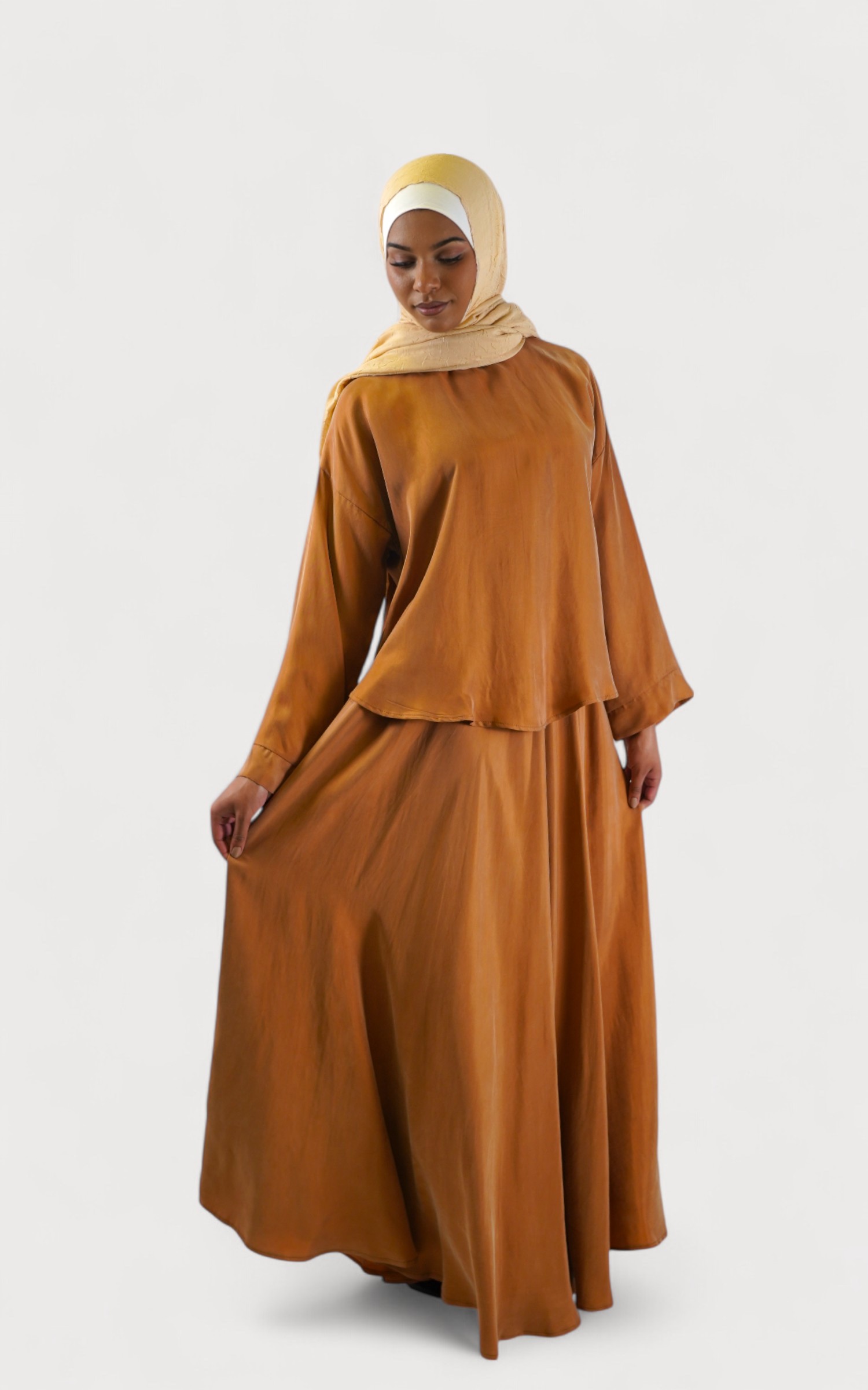 Dieses Ensemble vereint praktische Alltagstauglichkeit mit müheloser Eleganz. Der weit geschnittene Maxirock in Halbrundform bewegt sich sanft bei jedem Schritt und verleiht dem Look fließende Dynamik. Die klassische Silhouette macht ihn zu einer vielseitigen Wahl für jeden Anlass. Die lockere Tunika mit weiten Ärmelabschlüssen setzt moderne Akzente und bietet höchsten Tragekomfort. Einfach zu tragen und stilvoll zu kombinieren – dieses Set eignet sich ideal für den Alltag und besondere Momente.