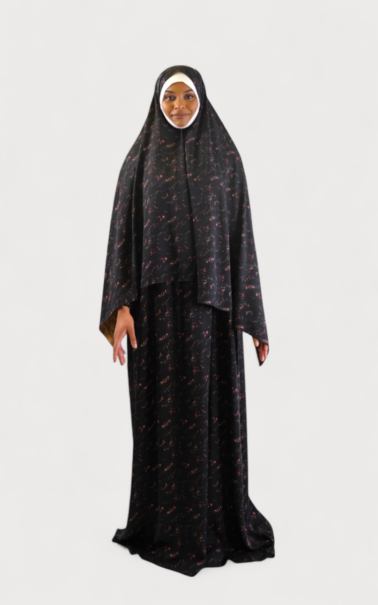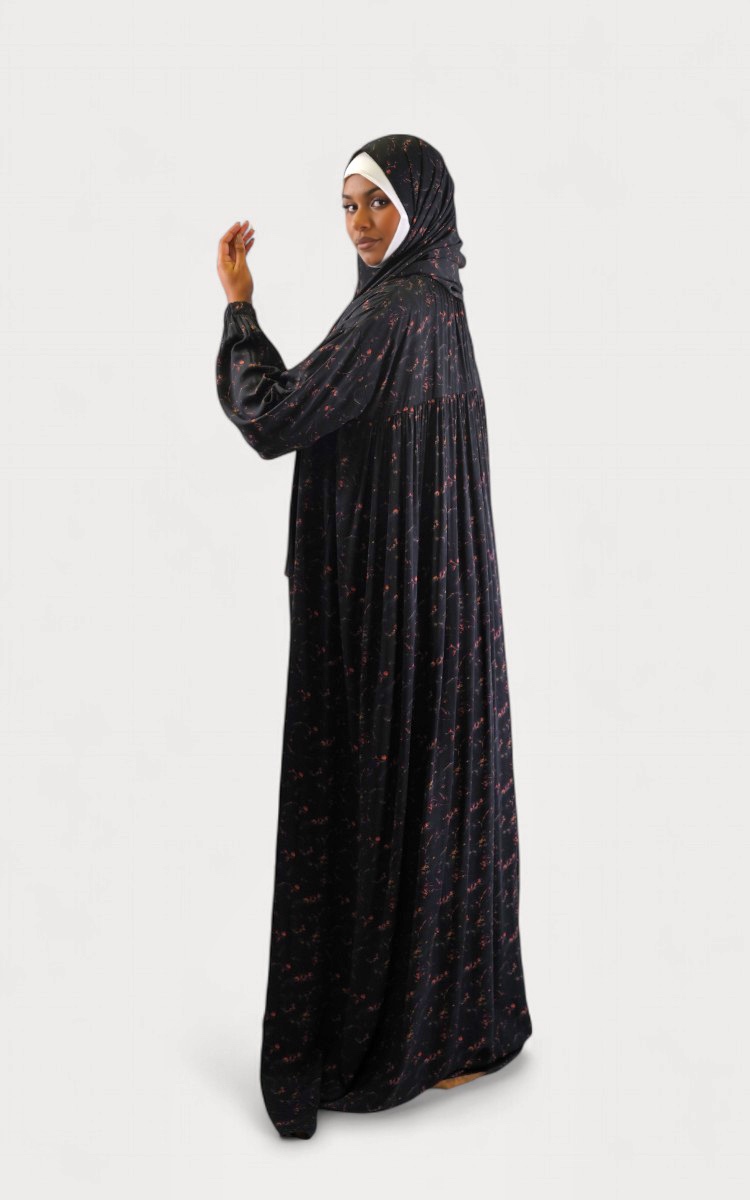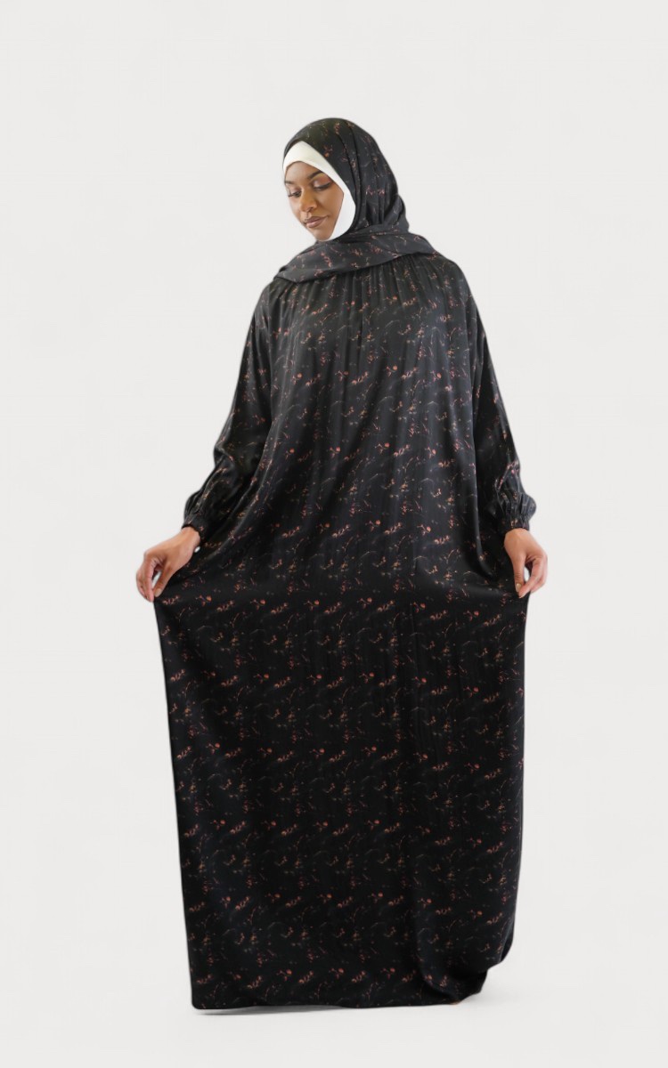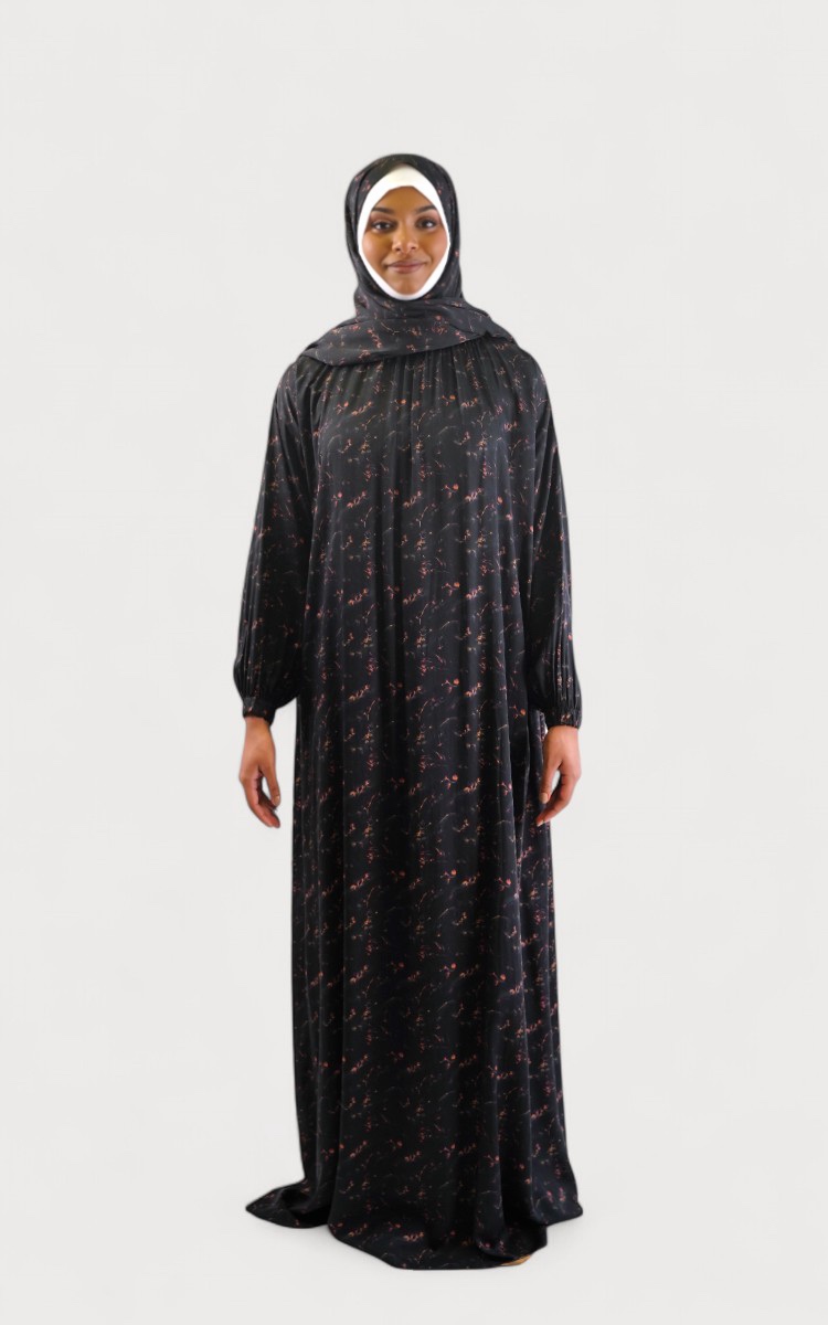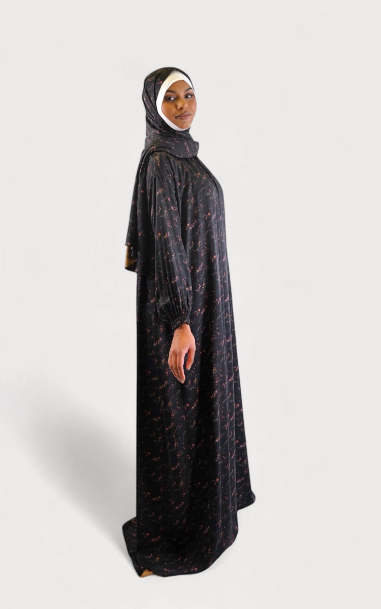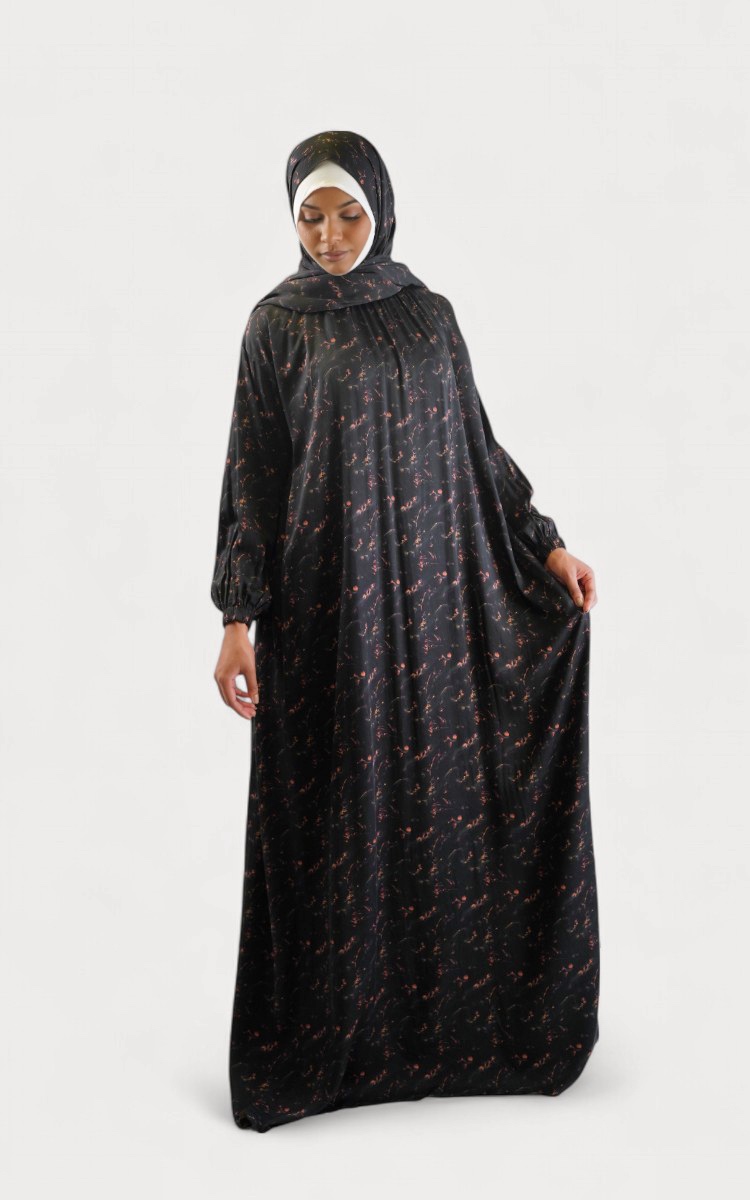 Maksimaalinen mukavuus ja keveys rukoukseen, kotiin ja ulkoiluun. Tämä pitkä mekko on huolella suunniteltu vastaamaan modernin musliminaisen tarpeisiin. Hengittävä ja kevyt kupro-stapeli tarjoaa liikkumisvapautta ilman läpinäkyvyyttä. Yhteensopiva huivi viimeistelee kokonaisuuden tehden asusta käytännöllisen ja harmonisen. Täydellinen valinta rukoukseen, arkeen ja matkalle.
