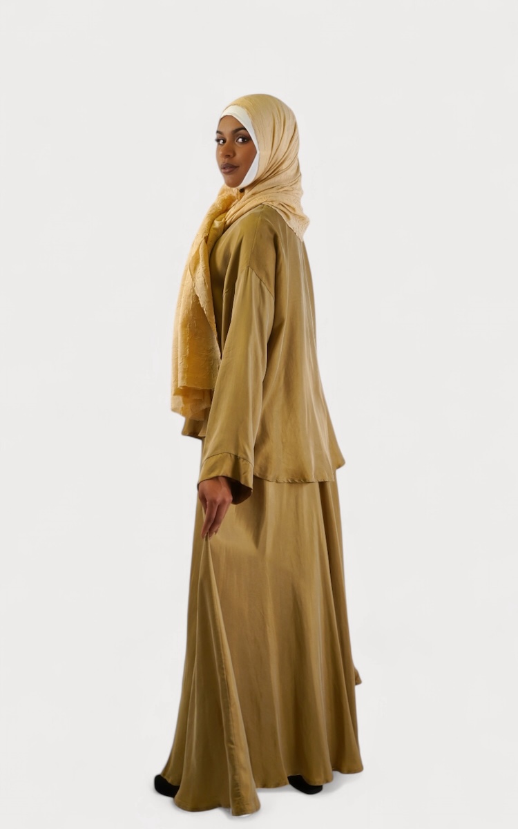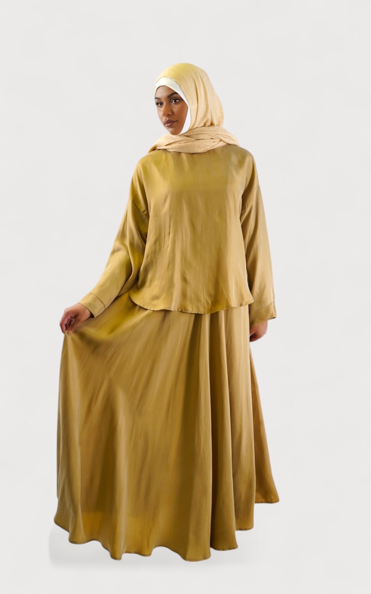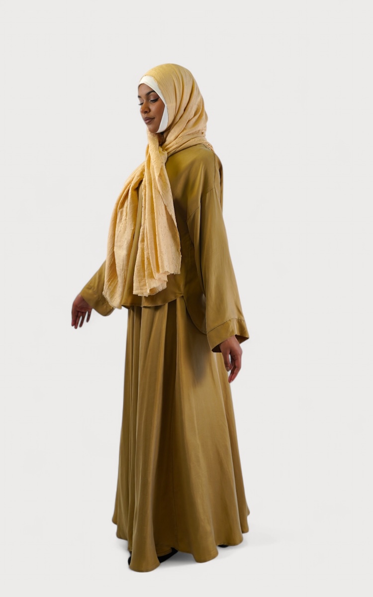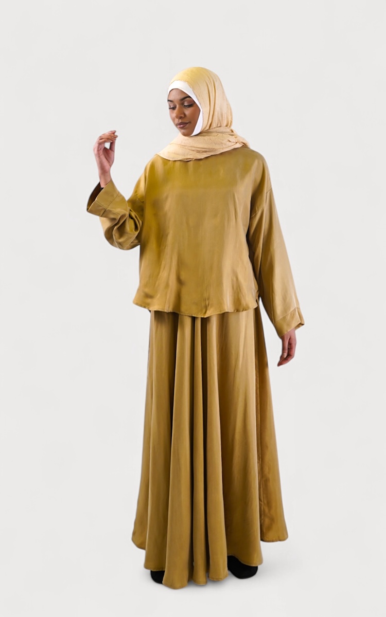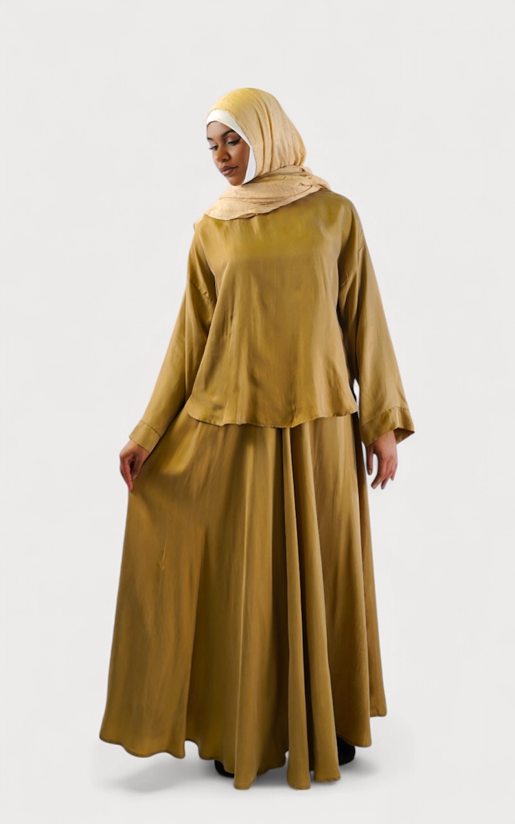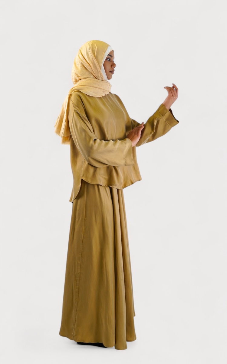 This ensemble blends practicality with effortless grace. The flowing semi-circle maxi skirt moves gently with every step, offering fluidity and elegance in motion. Its classic silhouette makes it a versatile choice for any occasion. The relaxed tunic with wide cuffs adds a modern touch while ensuring maximum comfort. Designed for easy, graceful wear, this set is ideal for both everyday looks and special moments.